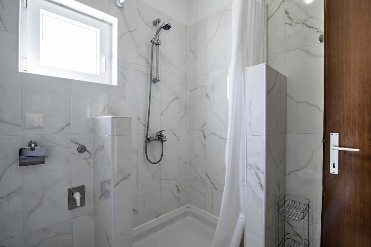 Das Badezimmer hat eine Duschkabine, ein Bidet, eine Toilette und einen Waschbecken. Diese Ferienwohnung ist ideal fὓr Paare oder Familien mit Kindern.