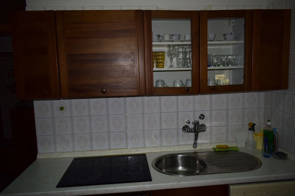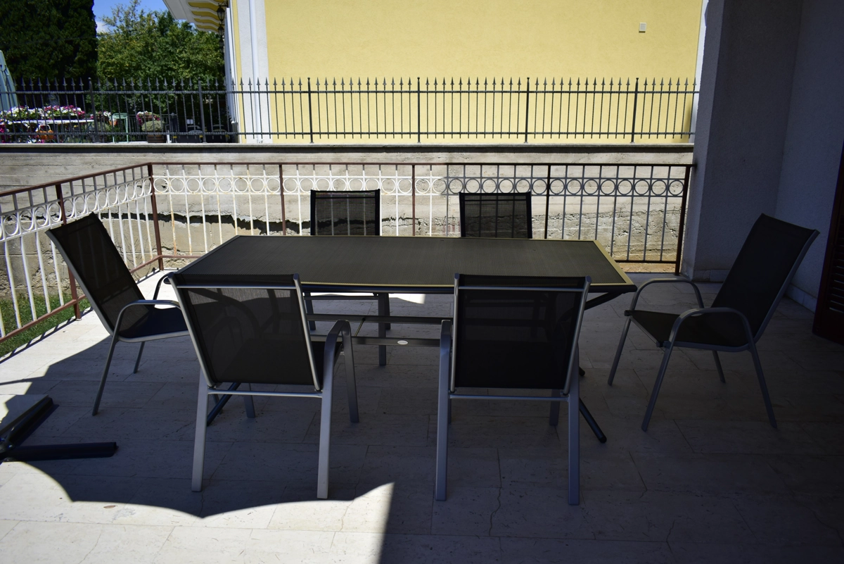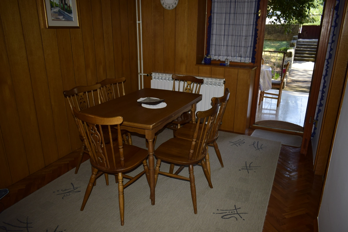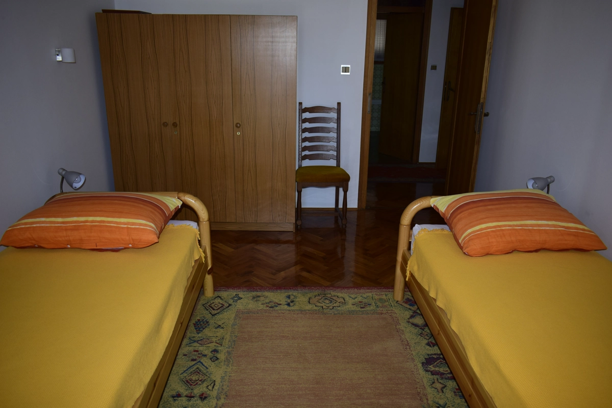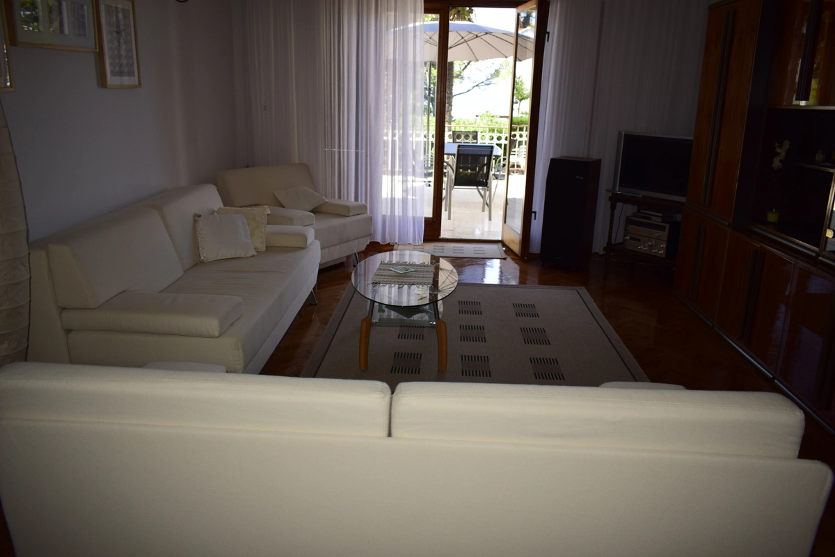 Diese geräumige Ferienwohnung befindet sich in Malinska auf der Insel Krk, kaum 30 Meter vom nächsten Strand entfernt. Das nächste Geschäft bzw. Restaurant sind 100 Meter entfernt. Sie befindet sich im Erdgeschoss eines Familienhauses in der Nähe des Zentrums von Malinska. Die Wohnung hat 2 Schlafzimmer (ein hat ein Doppelbett und ein zwei getrennte Betten), ein Wohnzimmer mit Ziehkautsch für zwei Personen, einen Essraum mit Esstisch und Stühlen, eine Küche mit Induktionsplatte, Backofen, Geschirrspülmaschine, Kaffeemaschine und einen grossen Kühlschrank mit Gefrierfach. Die Küche hat eine Speisekammer. Das Bad hat eine Duschkabine, ein Waschbecken und eine Waschmaschine sowie eine separate Toilette. Vom Wohnzimmer und von den Schlafzimmern kann man auf eine grosse Terrasse kommen, die einen Meerblick bietet. WiFi vorhanden. Parkmöglichkeit im Garage des Hauses.