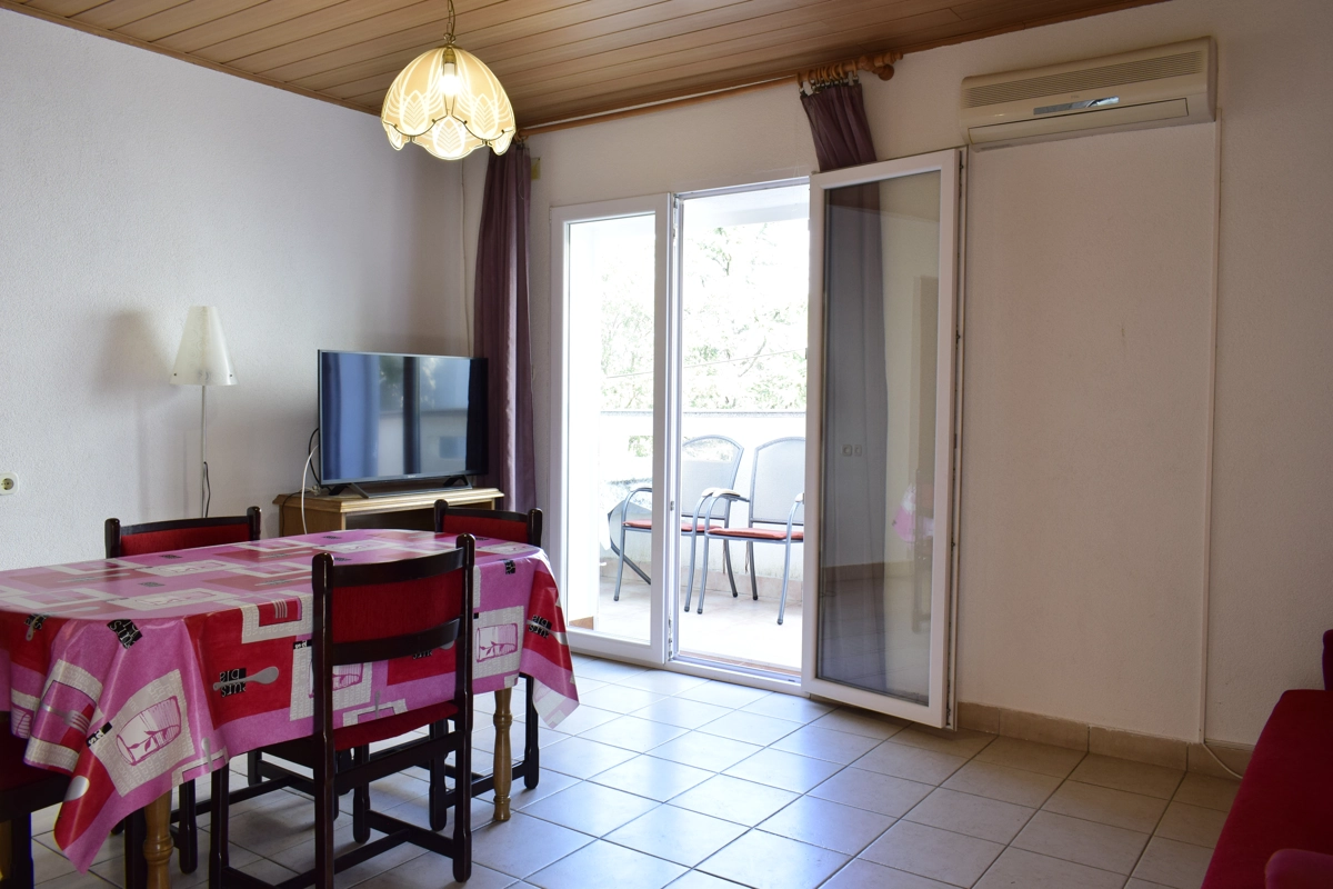 Ovaj udoban maleni apartman idealan za 3 osobe nalazi se na prvom katu obiteljske kuće u samom centru Malinske. Sastoji se od jedne spavaće sobe, kupaonice s tuš kabinom i dnevnog boravka spojenog s kuhinjom. U dnevnom boravku nalazi se kauč na razvlačenje za jednu osobu. Iz dnevnog boravka gosti imaju izlaz na balkon s pogledom na more. Ovaj stan je klimatiziran i povezan bežičnom mrežom. U prizemlju iza zgrade nalazi se terasa koja je zajednička i može se koristiti. Parking je osiguran ispred zgrade. Apartman je smješten na vrlo dobroj lokaciji tako da su plaže, restorani i trgovine u blizini.
