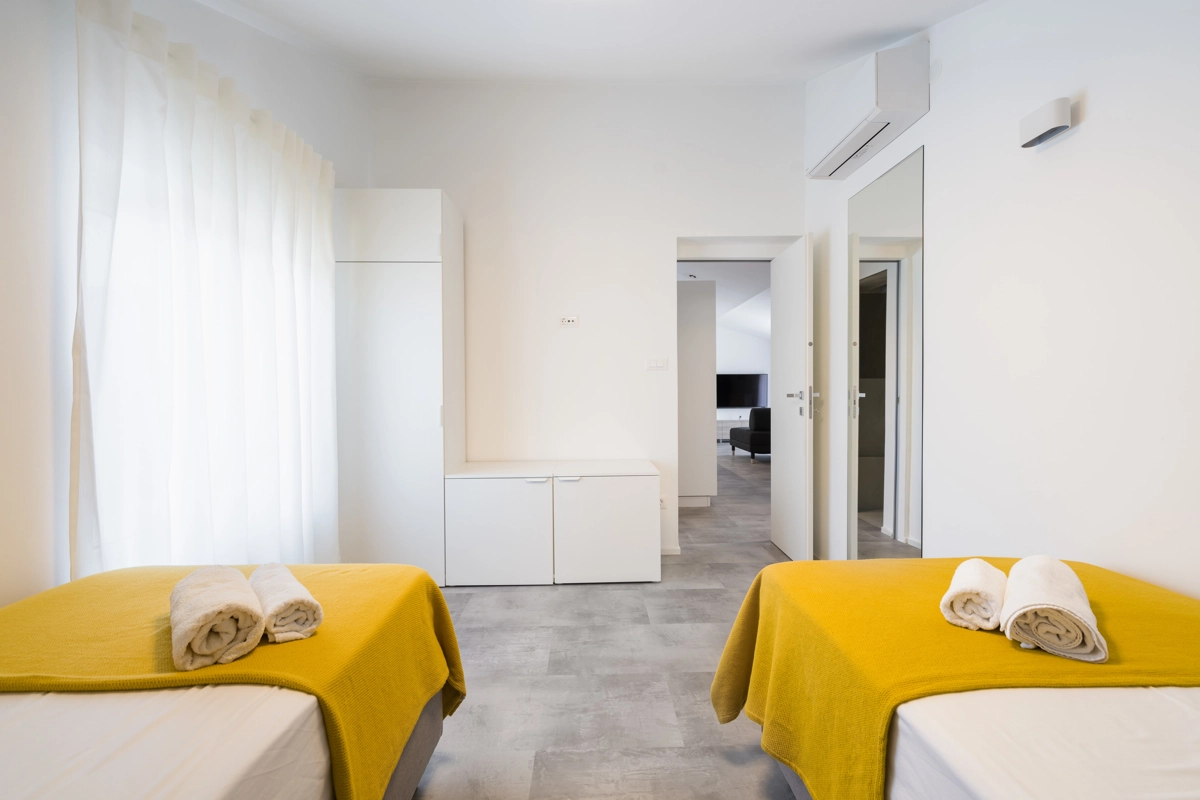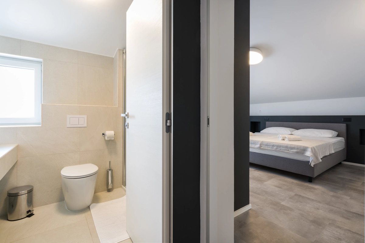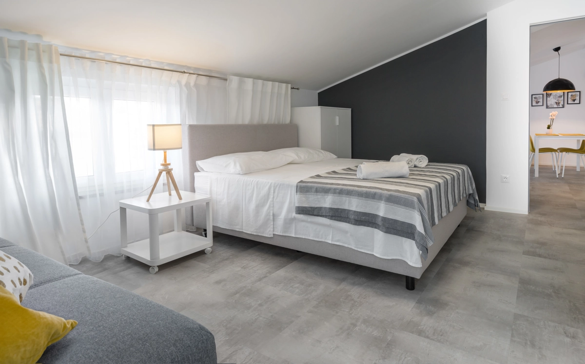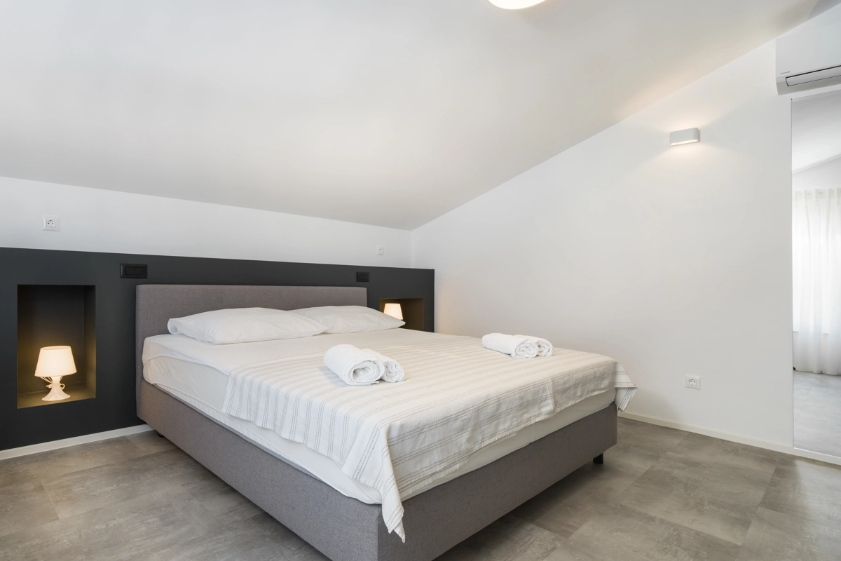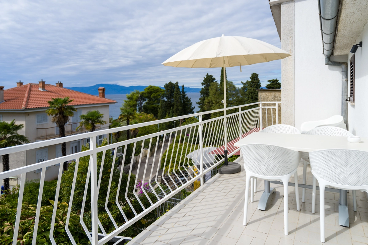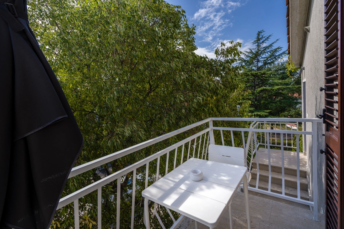 Ovaj prostrani novouređeni apartman s 4 zvjezdice za maksimalno 5 osoba i sa zasebnim ulazom se nalazi u Malinskoj na otoku Krku, na svega 50 metara od najbliže plaže, 150 metara od najbližeg dućana, 50 metara od najbližeg restorana te 100 metara od centra grada. Apartman se nalazi na drugom katu obiteljske kuće, te se sastoji od 2 prostrane spavaće sobe, velikog dnevnog boravka u kombinaciji s blagovaonicom u kojoj se nalaze stol i stolice, televizija sa satelitskim prijemom, kauč na razvlačenje na kojemu može boraviti još jedan dodatna osoba, funkcionalne kuhinje s pećnicom, pločama za kuhanje, frižiderom s ledenicom te svim posuđem potrebnim za kuhanje i jelo. Apartman također sadrži perilicu za suđe i perilicu za pranje rublja. Iz kuhinje, gosti imaju dostupan izlazak na prostrani balkon koji pruža prekrasan pogled na more, te na kojemu mogu uživati u vrućim ljetnim danima. Kupaonica se sastoji od tuš kabine, wc-a te umivaonika. U apartmanu se nalazi i zasebni toalet. Privatni parking je osiguran na bočnoj strani zgrade. Gosti također imaju mogućnost uporabe roštilja koji se nalazi u dvorištu zgrade.