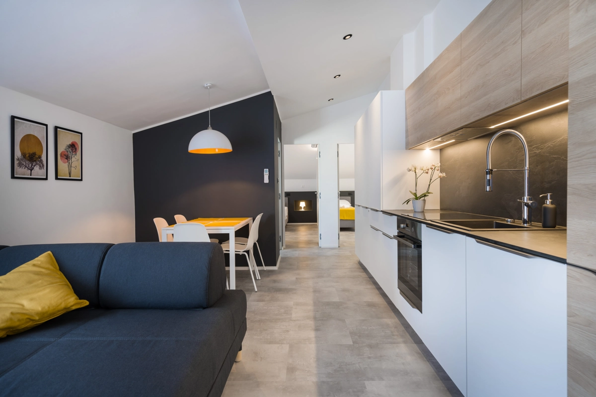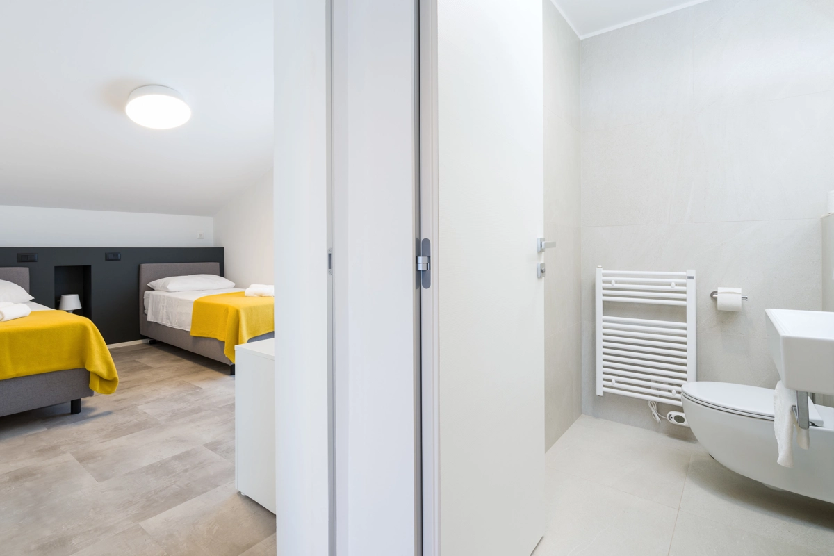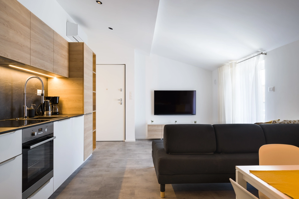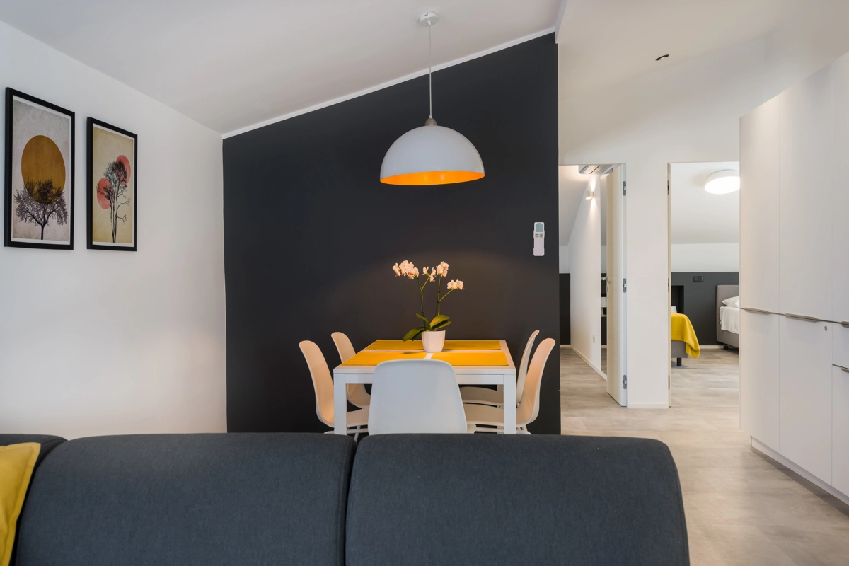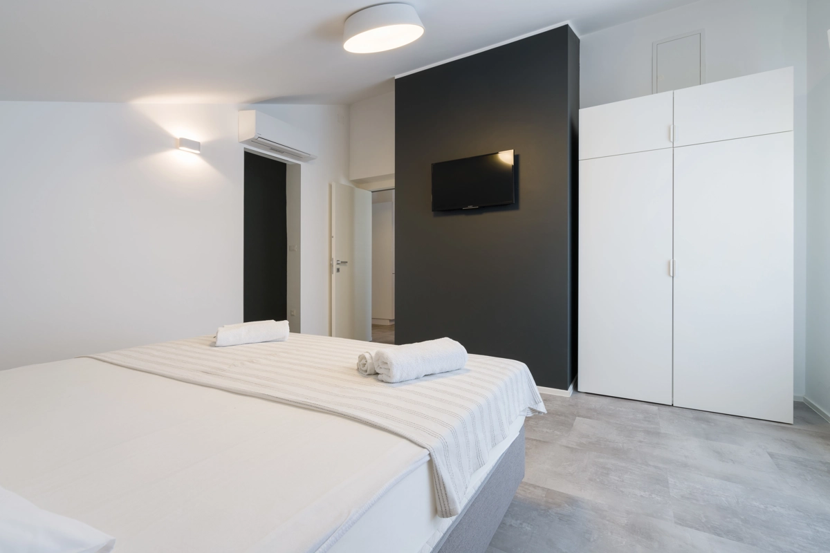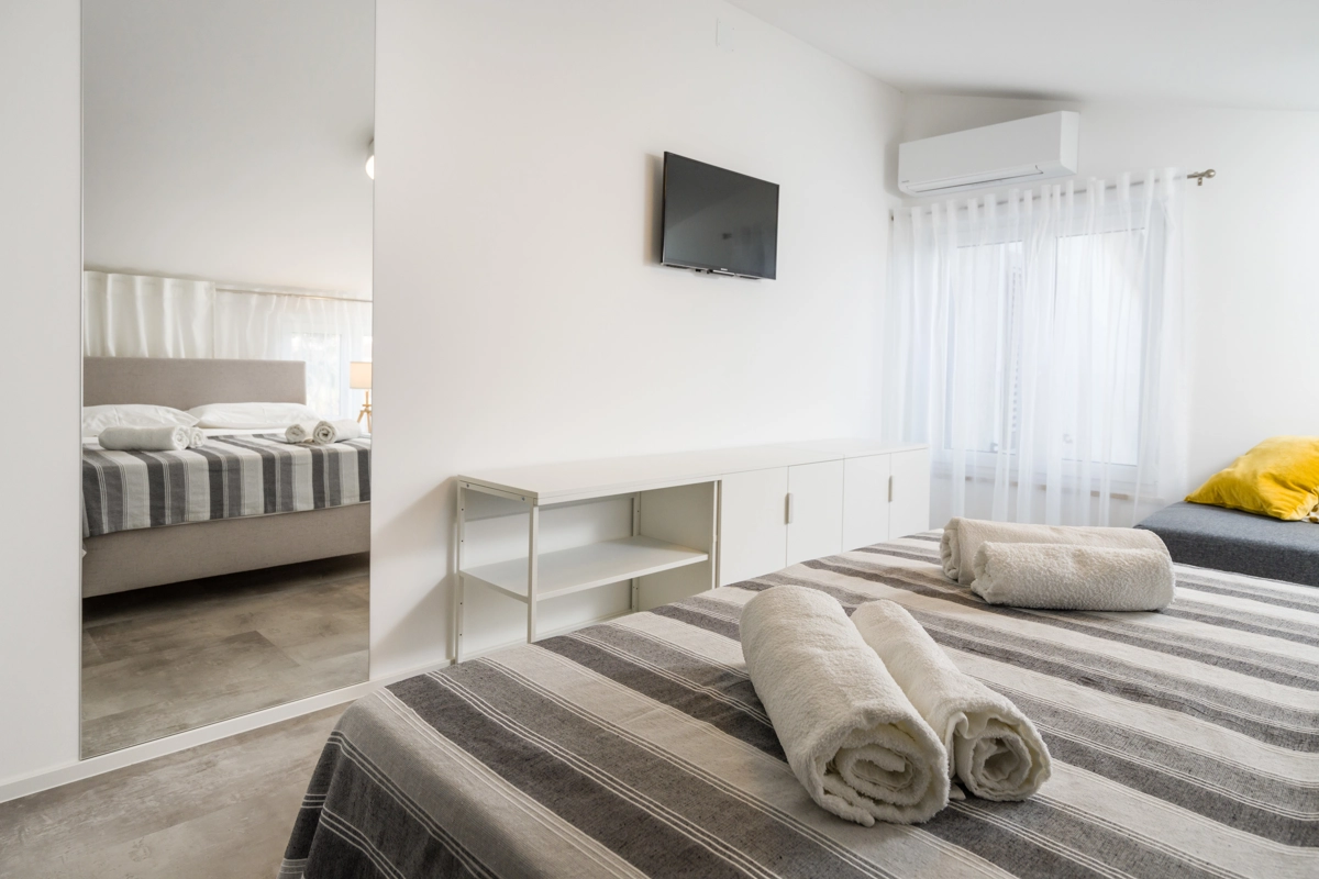 Ovaj prostrani novouređeni apartman s 4 zvjezdice za maksimalno 5 osoba i sa zasebnim ulazom se nalazi u Malinskoj na otoku Krku, na svega 50 metara od najbliže plaže, 150 metara od najbližeg dućana, 50 metara od najbližeg restorana te 100 metara od centra grada. Apartman se nalazi na drugom katu obiteljske kuće, te se sastoji od 2 prostrane spavaće sobe, velikog dnevnog boravka u kombinaciji s blagovaonicom u kojoj se nalaze stol i stolice, televizija sa satelitskim prijemom, kauč na razvlačenje na kojemu može boraviti još jedan dodatna osoba, funkcionalne kuhinje s pećnicom, pločama za kuhanje, frižiderom s ledenicom te svim posuđem potrebnim za kuhanje i jelo. Apartman također sadrži perilicu za suđe i perilicu za pranje rublja. Iz kuhinje, gosti imaju dostupan izlazak na prostrani balkon koji pruža prekrasan pogled na more, te na kojemu mogu uživati u vrućim ljetnim danima. Kupaonica se sastoji od tuš kabine, wc-a te umivaonika. U apartmanu se nalazi i zasebni toalet. Privatni parking je osiguran na bočnoj strani zgrade. Gosti također imaju mogućnost uporabe roštilja koji se nalazi u dvorištu zgrade.