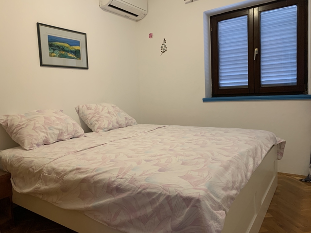 Ovaj predivan apartman sa zasebnim ulazom na lijevoj strani zgrade smješten je na prvom katu obiteljske kuće oko 250 metara od glavne plaže u mjestu Porat na otoku Krku. Apartman može primiti 4 osobe. Sastoji se od 2 odvojene spavaće sobe, kupaonice s tuš kabinom, wc-om i umivaonikom, kuhinje spojene s dnevnim boravkom i balkonom koji pruža pogled na more. Gosti u apartmanu imaju sve što im je potrebno za odmor: posteljina, ručnici, sapun, toaletni papir, kuhinjski aparati, pribor za kuhanje i jelo. Ukoliko gosti žele ići na opremljenu plažu s besplatnim tušem, posjetiti mali kafić na plaži i živuću atmosferu ili ukoliko preferiraju prirodu s malom udobnom plažom za dvoje, sve se to nalazi na distanci od apartmana u radijusu od 500 metara. U gradu se nalazi pekara sa svježim kruhom i pekarskim proizvodima svako jutro. Također, za ručak ili romantičnu večeru u centru Porta nalaze se dva restorana koja poslužuju lokalnu i riblju kuhinju, kao i pizzerija. Ovo je udaljeno od apartmana svega 5 minuta laganog hoda. Mala trgovina je blizu, svega 10-ak minuta hoda od apartmana. Tokom cijelog dana, gosti se mogu voziti cestovnim vlakićem do Malinske i natrag. U Portu se nalazi samostan i crkva Marije Magdalene, u kojemu se također nalazi muzej o povijesti grada i načina življenja u povijesti. U blizini apartmana se nalazi farma sa sezonskim organskim povrćem i voćem.