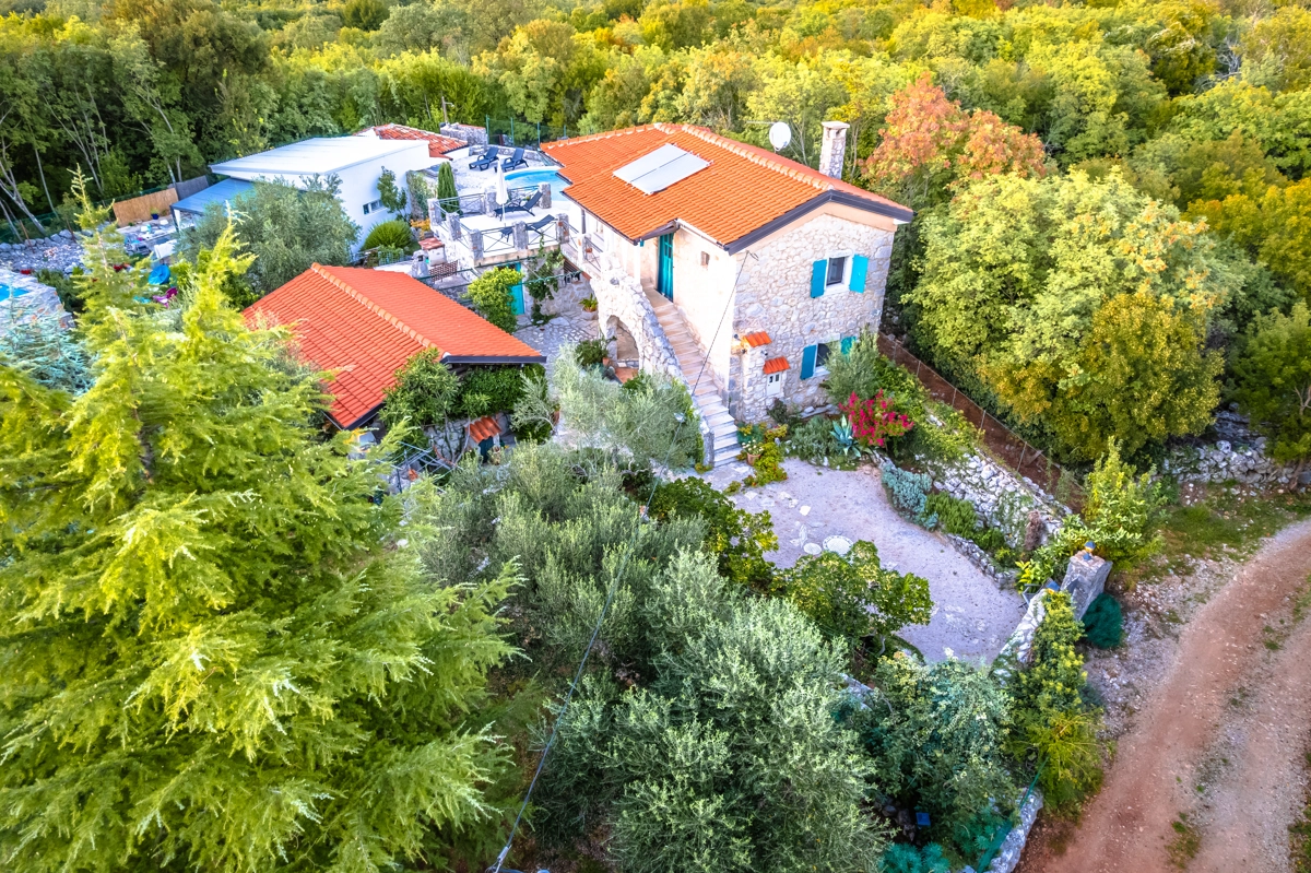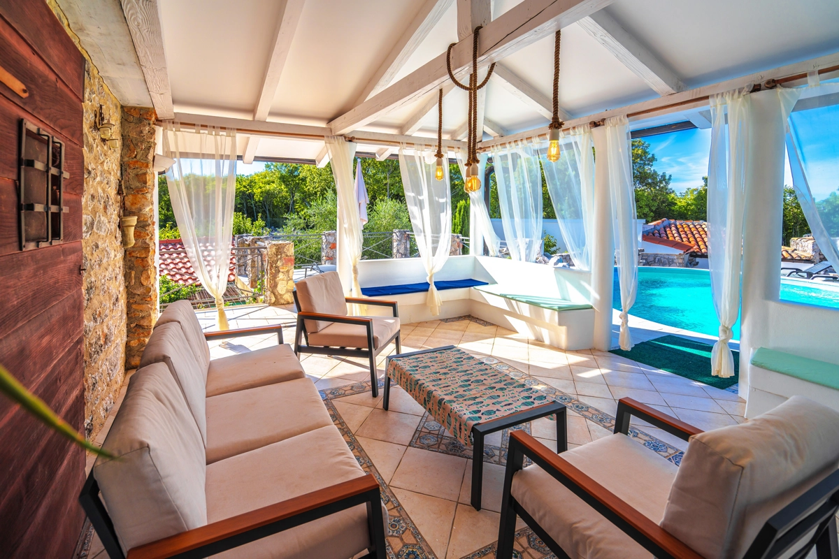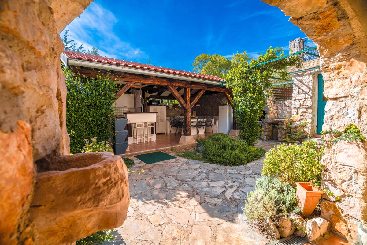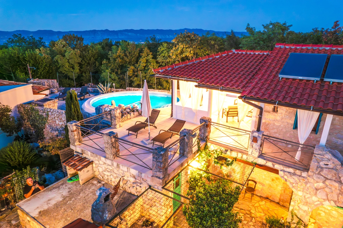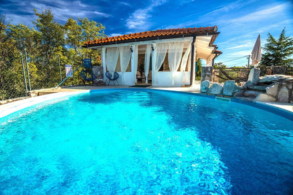 This beautiful villa with a swimming pool is located in Gabonjin on the island of Krk. It is ideal for up to a maximum of 8 people. It consists of 4 rooms (3 rooms with double beds and 1 with a bunk bed), a living room with a plasma TV and a fireplace connected to a fully equipped kitchen with all the necessary utensils for cooking and eating, a refrigerator, a stove, a microwave oven and a washing machine. washing dishes. The villa has 2 bathrooms and a washing machine. Outside the villa, guests have access to a terrace with a summer kitchen and barbecue, as well as a swimming pool. The villa is equipped with air conditioning, free Wi-Fi and private parking.